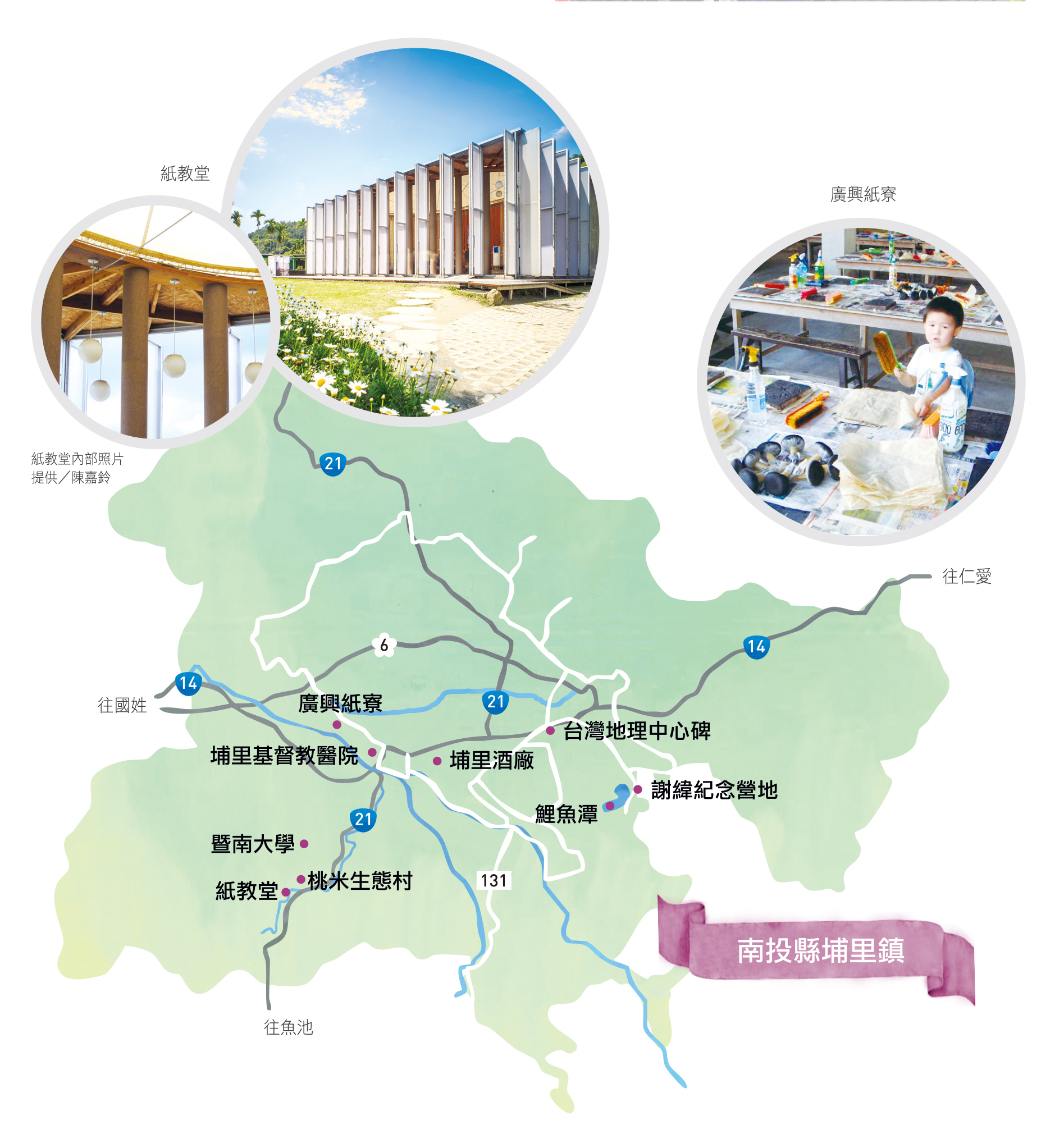 此外,埔里有不少提供親子動手體驗的觀光工廠、博物館及農場等私人設施,例如全台第一間造紙觀光工廠廣興紙寮等,可以帶孩子前來享受手做的樂趣。埔里周圍景點甚多,如日月潭、廬山溫泉、清境農場、奧萬大等,都可順道一遊。